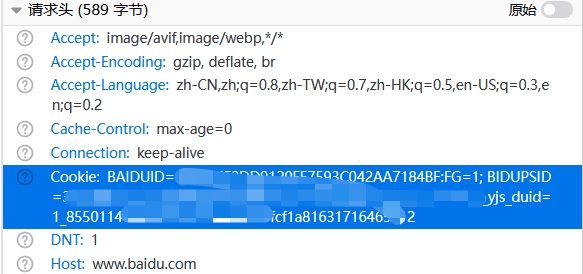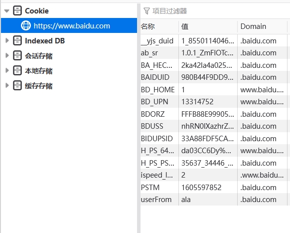 为了方便理解做个例子,首先我们登录baidu.com网站,此时我们就收到了服务器传来的cookie,假设里面有登录凭证。