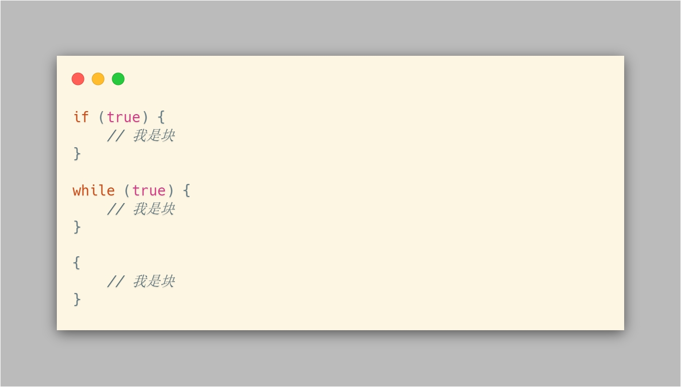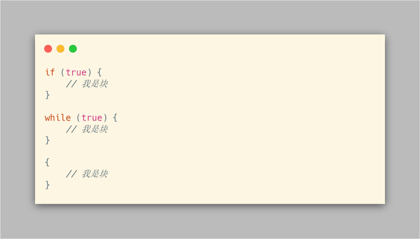 所谓的块,就是代码块,有一对大括号包裹的区域。