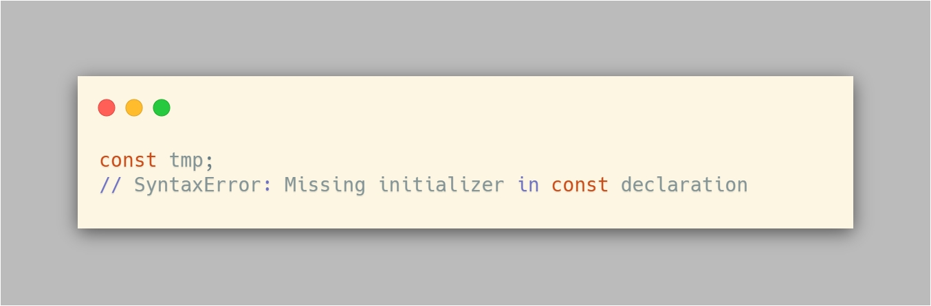 因为const声明的是常量,因此应当在声明时就赋值(初始化),不能像let一样,先声明再赋值。
