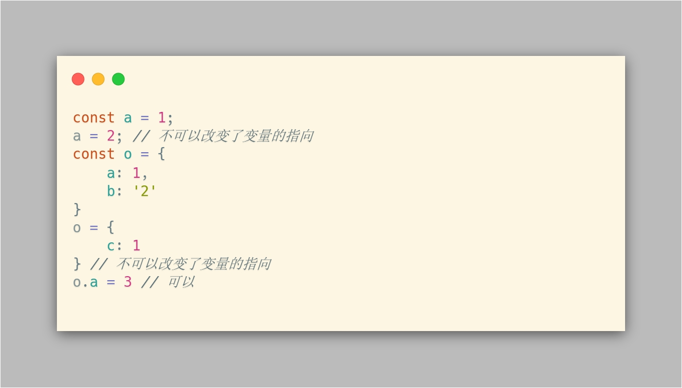 但是对于引用类型来说(Object),变量指向的内存地址,保存的只是一个指向实际数据的指针,因此const只能保证变量指向的地址是固定的(即总是指向另一个固定的地址),但是不能保证变量指向的那个指针的指向不变,因此也就不能保证引用类型的值不变。